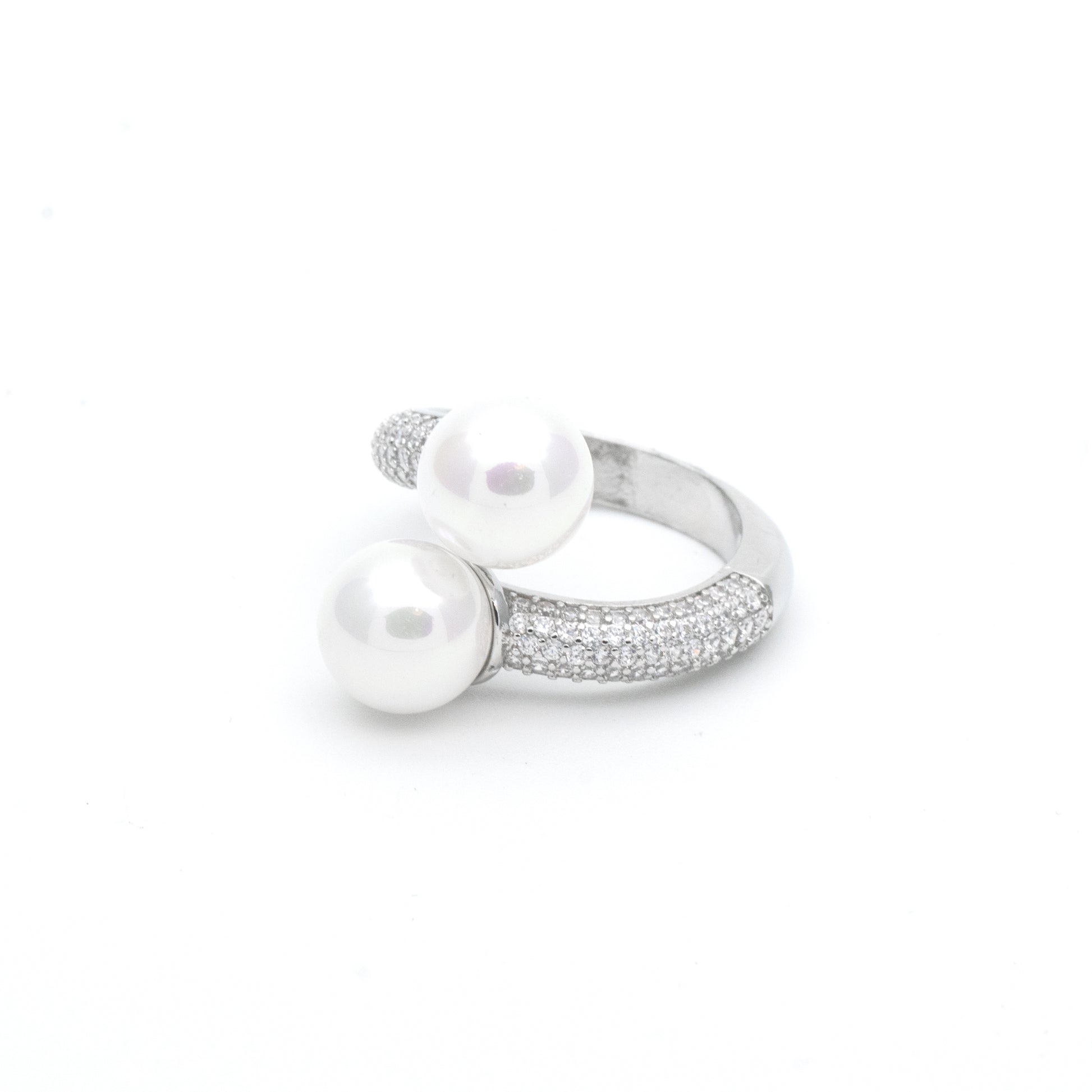 Anello contrariè argentato, con perle e pavè di zirconi bianchi.
