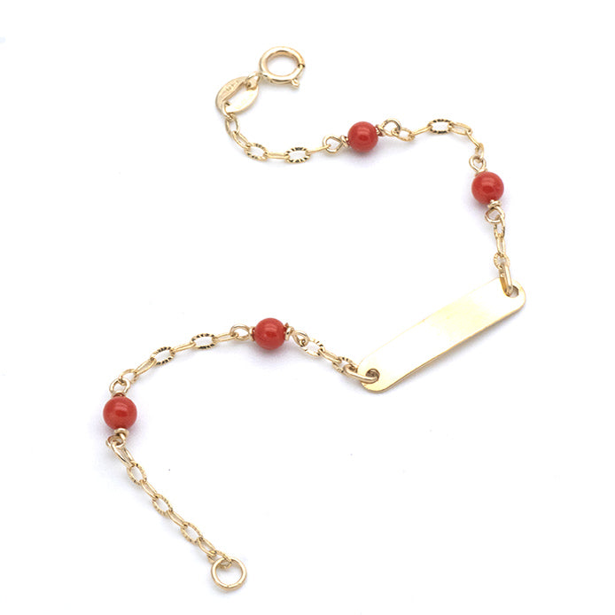 Bracciale da bambini in oro giallo 9 kt. - 375 con sfere in corallo e targhetta personalizzabile.