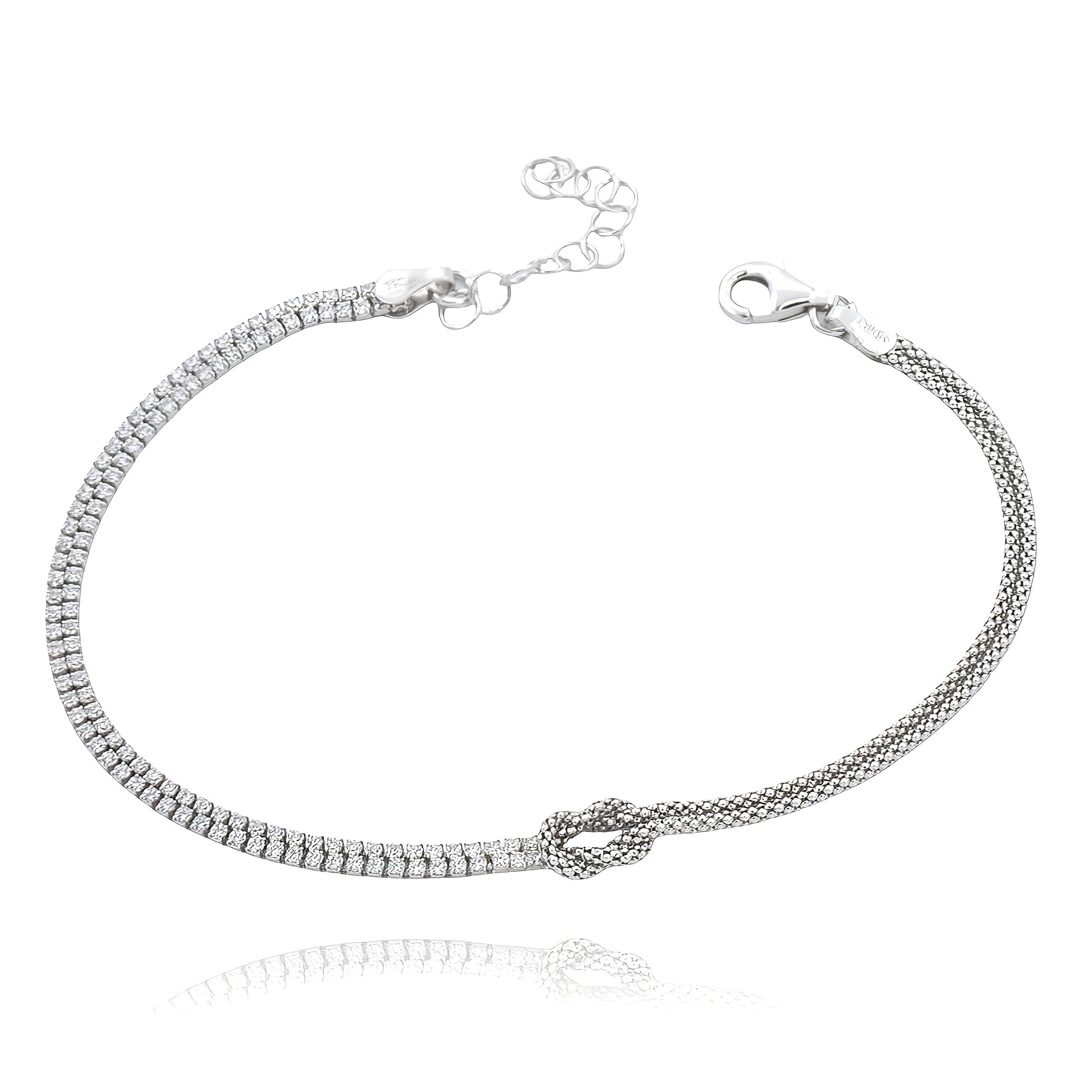 Bracciale nodo doppio filo in argento 925 placcato oro bianco, metà maglia Fope e metà tennis con zirconi bianchi.