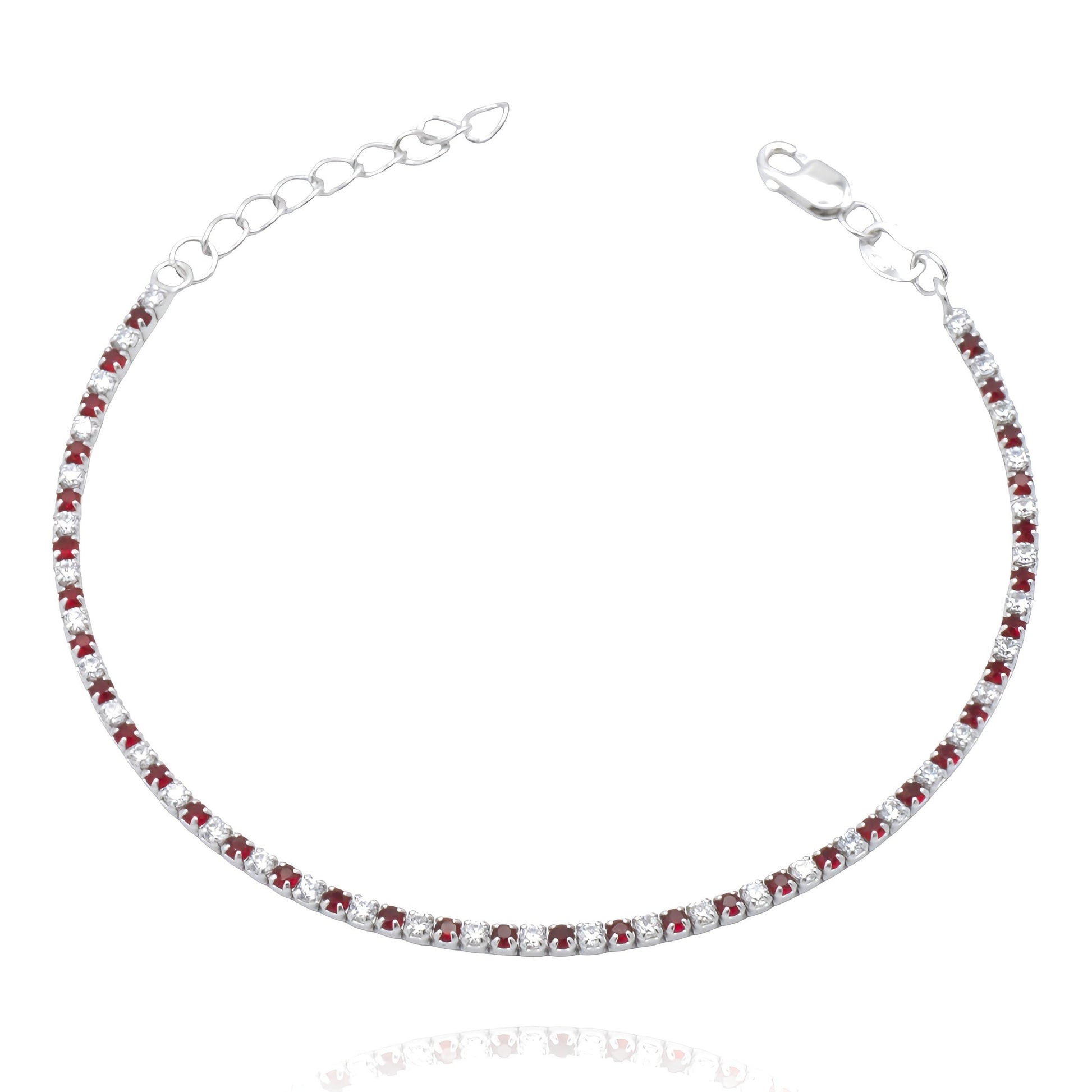 Bracciale in Argento 925 placcato oro bianco modello tennis, con pietre bianche e rosse.