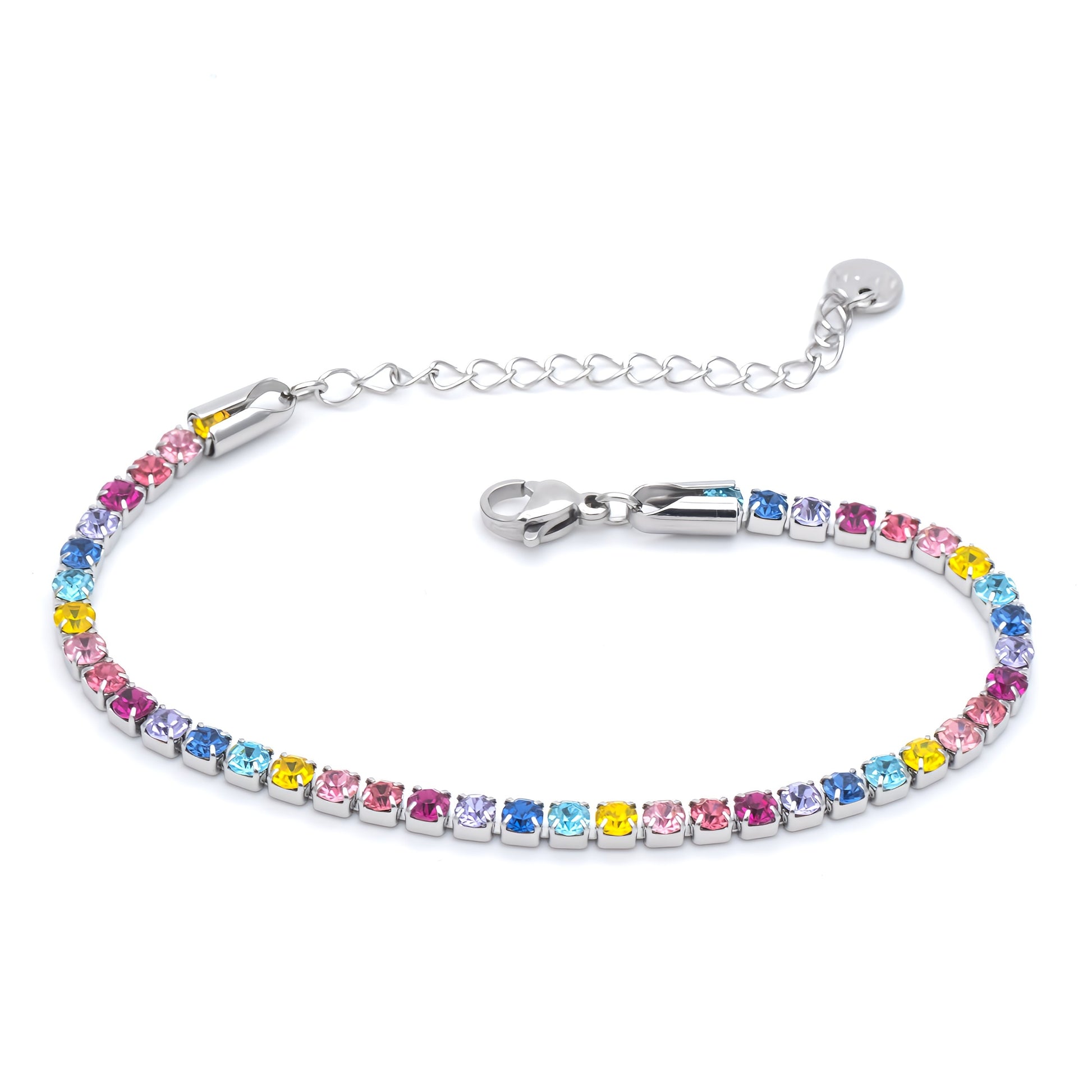 Bracciale tennis in acciaio argentato con zirconi di vari colori.