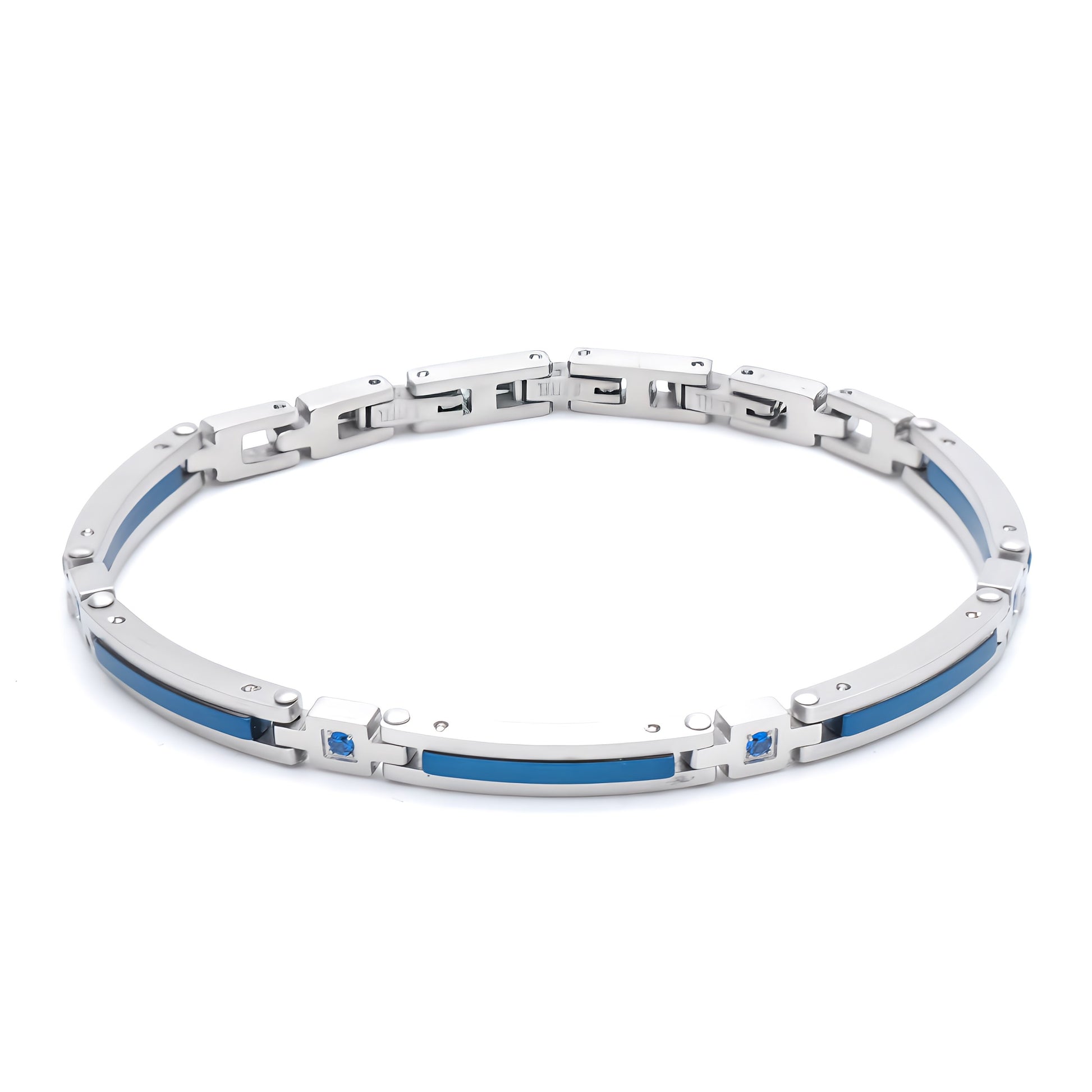 Bracciale da uomo a piaste in acciaio e ip blu, con zirconi.