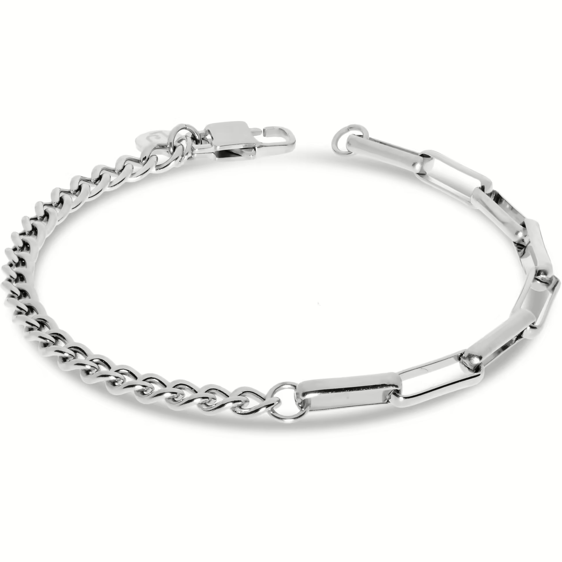 Bracciale da uomo della collezione LiuJ o in acciaio a doppia catena catena con metà lavorazione differente. Il gioiello ha la chiusura a moschettone.