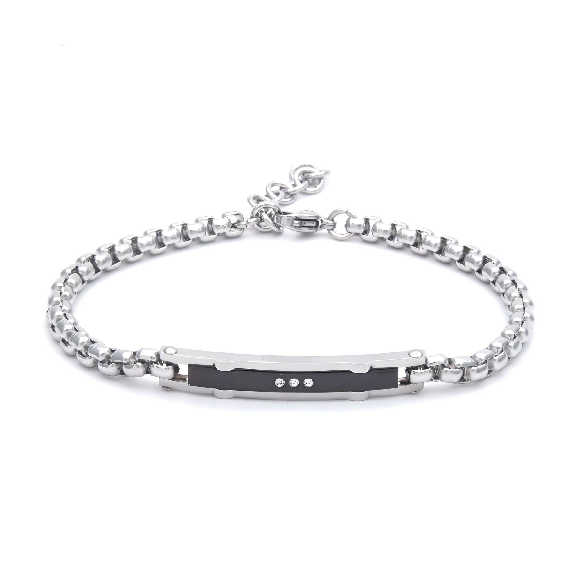 Bracciale da uomo in acciaio a catena, con targhetta nera e zirconi bianchi.