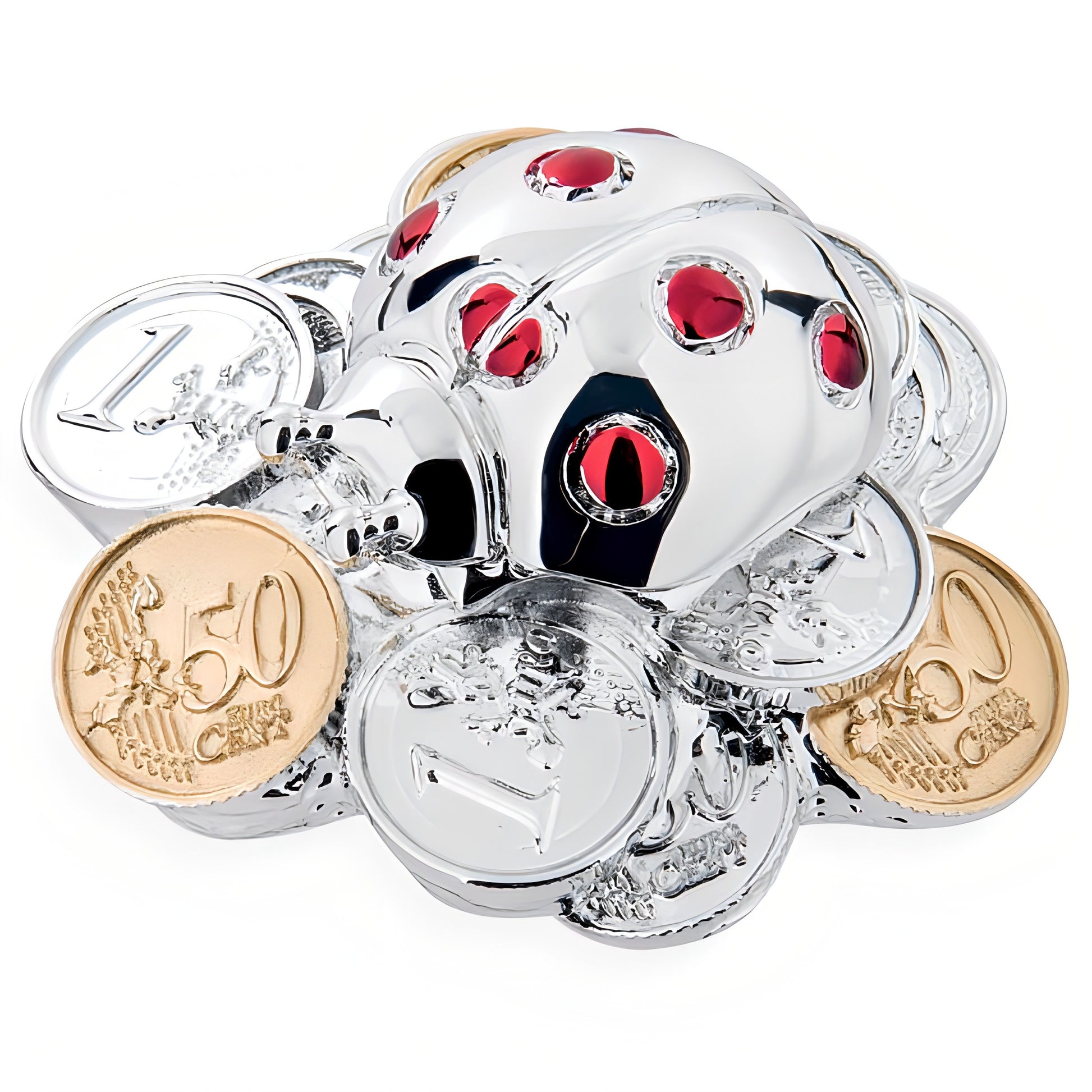 Coccinella con monete portafortuna in resina argentata e dipinta.