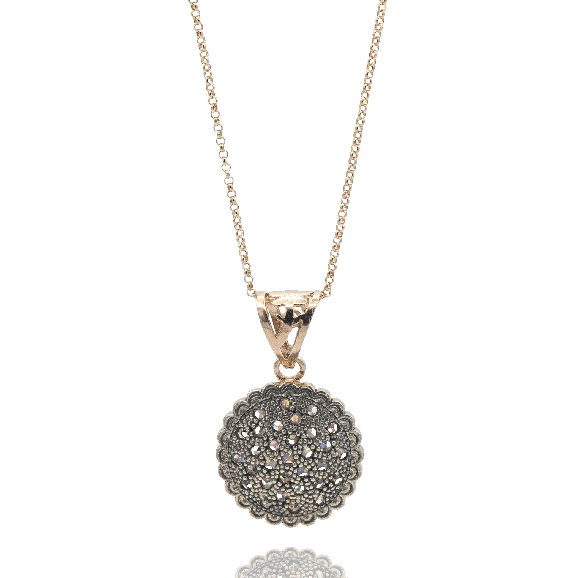 Collana in argento 925 placcato oro rosa, con pendente a toppa, modello vintage. Dettagli bruniti impreziositi da zirconi naturali incastonati a mano.