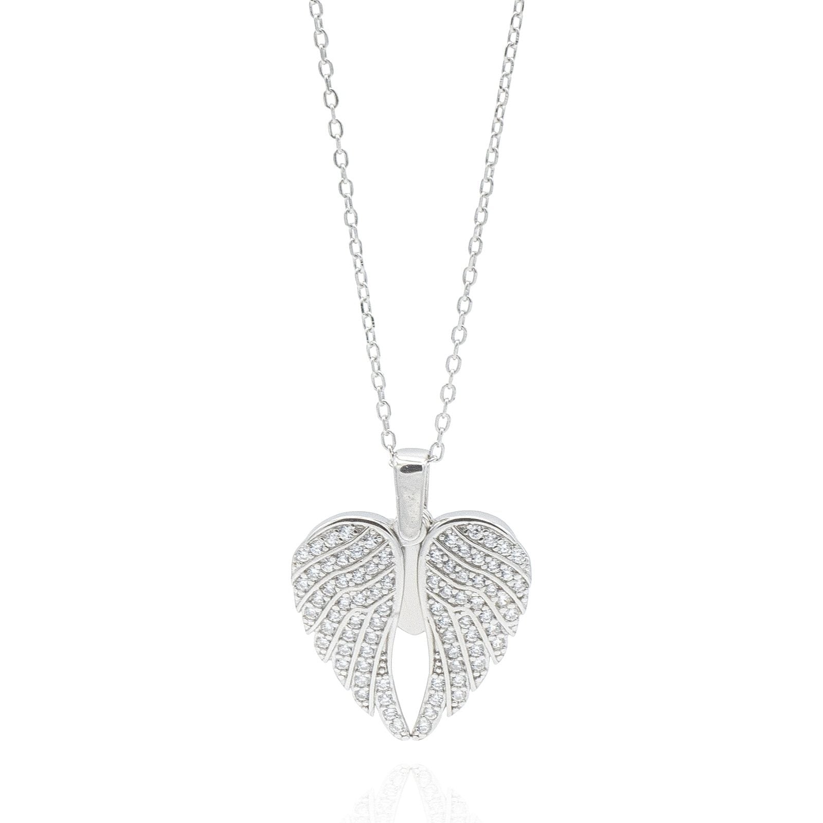 Collana realizzata in Argento 925 placcato oro bianco, si compone da ali d'angelo a pavè di zirconi bianchi che, aprendosi, lasciano spazio ad un cuore sul quale è possibile incidere.