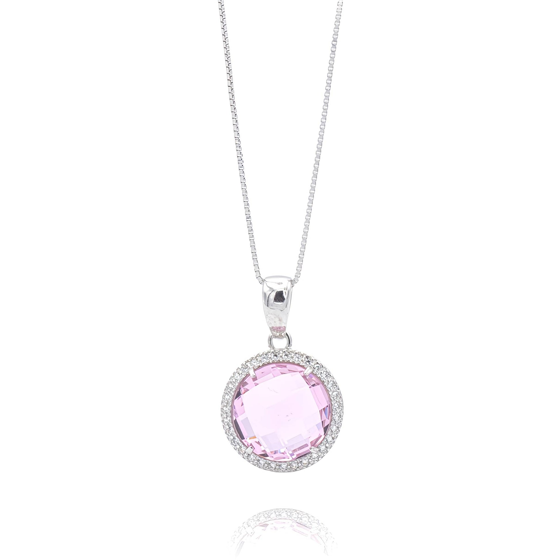Collana in Argento 925 placcato oro bianco, con pietra rosa incastonata su montatura a 4 griffe e contorno di zirconi bianchi.