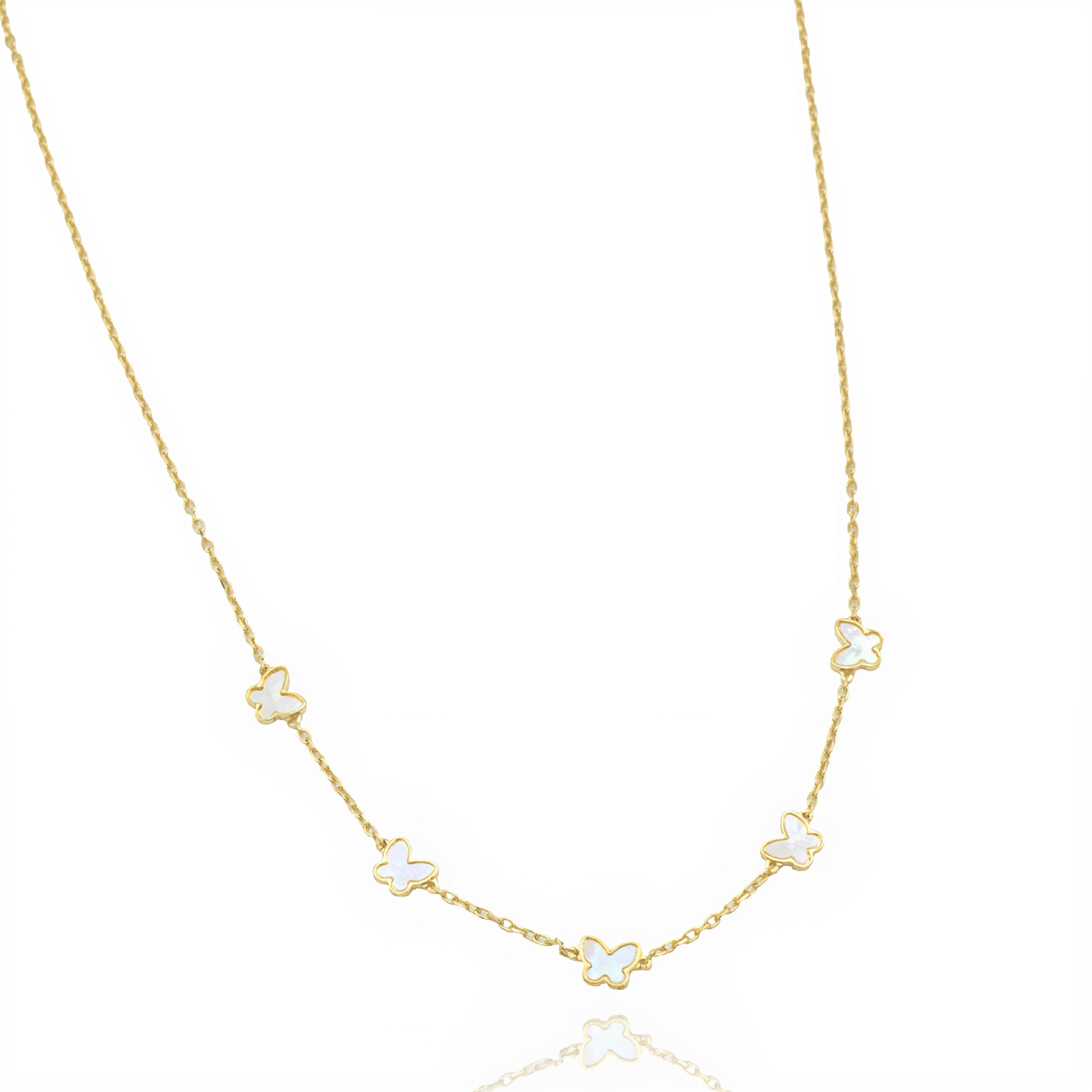 Collana girocollo in argento 925 placcato oro giallo con farfalle e madreperla.