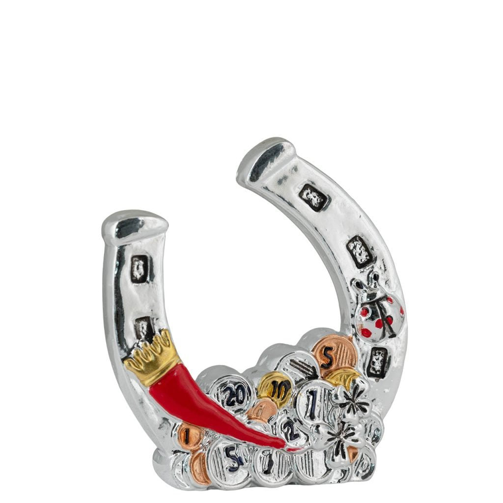 Ferro di cavallo argentato, con corno smaltato e simboli portafortuna.