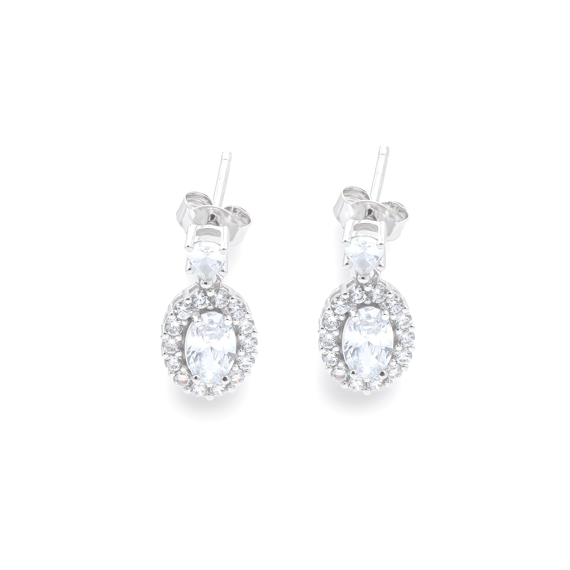 Eleganti orecchini con pendente ovale modello "Kate" in pietra bianca e contorno di zirconi, sovrastati da un punto luce bianco a taglio goccia.