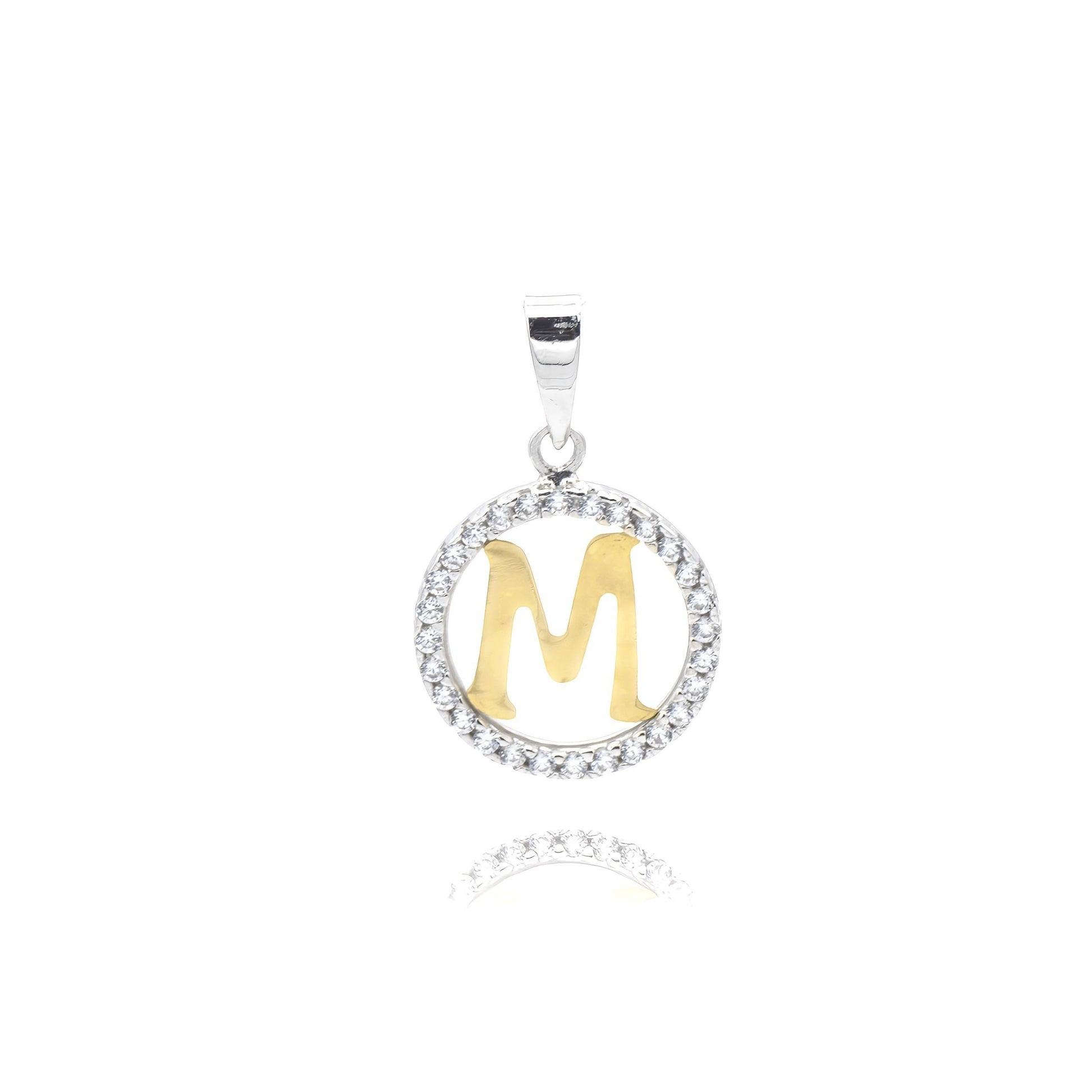 Pemdente tondo in oro bianco 18 carati - 750 e zirconi, con lettera M in oro giallo.