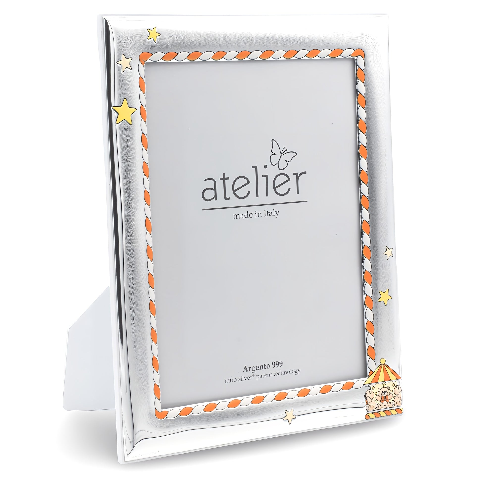 Portafoto bimbo in argento laminato "Orsetto e fiocco" colore neutro.